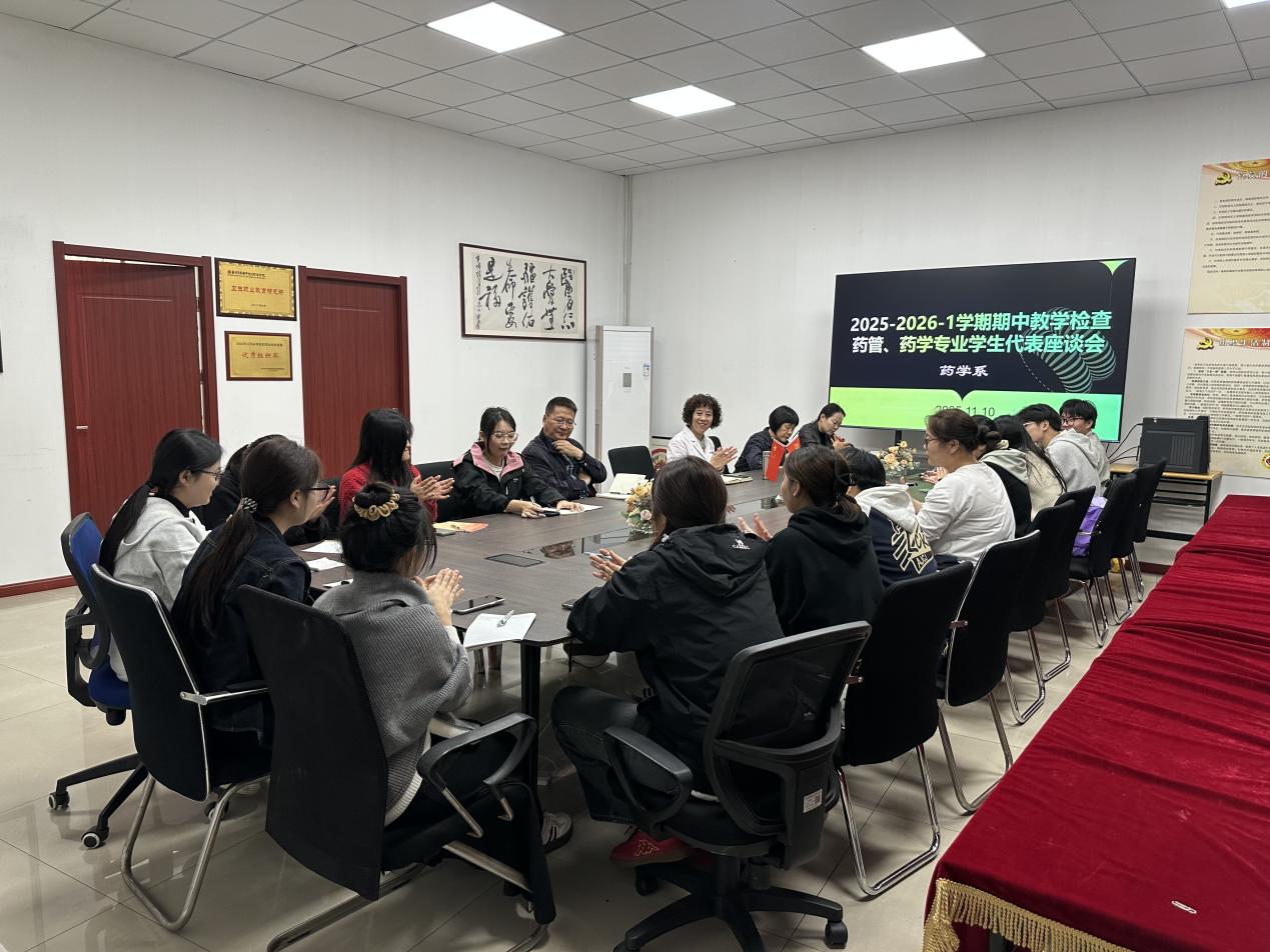 2025年11月10日,医学院药学系召开2025–2026学年第一学期期中教学检查学生代表座谈会。会议由药学系主任祝祎玮主持,副院长於学良、各教研室负责人及2024级、2025级药学、药品经营与管理专业学生代表参会。