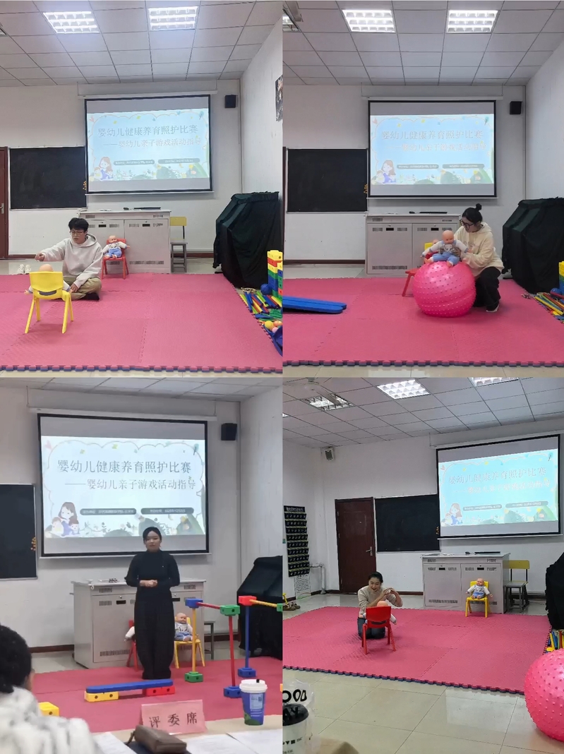 本次比赛紧扣0-3岁婴幼儿发展规律,聚焦亲子游戏指导核心技能,设置两大核心赛项:18-24个月幼儿大运动游戏方案设计与实施、11个月幼儿亲子游戏与科学养育指导方案设计与实施。赛场上,选手们结合婴幼儿生长发育特点,从游戏目标设定、内容设计、材料选择到现场指导,全方位展现专业功底——针对18-24个月幼儿的大运动发展需求,设计出跳跃训练、平衡锻炼等趣味游戏,融入空间知觉培养与动作协调性训练;面向11个月幼儿则侧重感官刺激与亲子互动,将科学喂养、回应性照护等知识融入游戏设计,实现“玩中学、育中长”的教育目标。